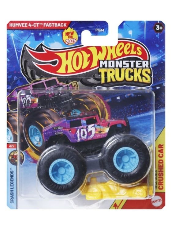 Colectioneaza masinutele Hot Wheeels gigantice pentru numeroase cascadorii. Striviti competitia cu masinuta de baza 164 are motoare puternice de frecare si actiuni feroce pe roti, acesti monstri sunt de neoprit. Fiecare se vinde separat, in functie de disponibilitate. Culorile si decoratiunile pot varia. Acest pachet contine personajul Humvee 4-ct Fastback.