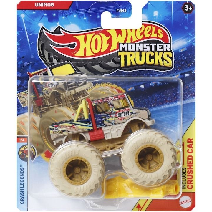 Colectioneaza masinutele Hot Wheeels gigantice pentru numeroase cascadorii. Striviti competitia cu masinuta de baza 164 are motoare puternice de frecare si actiuni feroce pe roti, acesti monstri sunt de neoprit. Fiecare se vinde separat, in functie de disponibilitate. Culorile si decoratiunile pot varia. Pachetul contine masinuta Unimog.