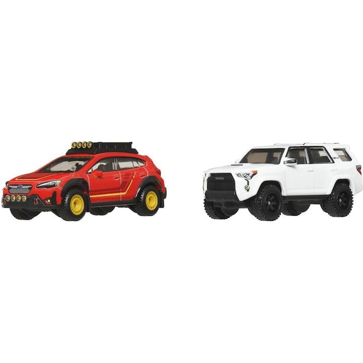 Fiecare masina metalica a duoului (la scara 164) este realizata cu atentie cu anvelope Real Riders, un sasiu metalic si decoratiuni autentice si detaliate. Cu cate 2 masini in fiecare set, pasionatii de masini au doua sanse sa-si gaseasca preferatele si sa inceapa sau sa-si extinda colectia! Acest pachet contine 2 masinute metalice Hot Wheels SUBARU CROSSTREK SI TOYOTA 4RUNNER 2018.