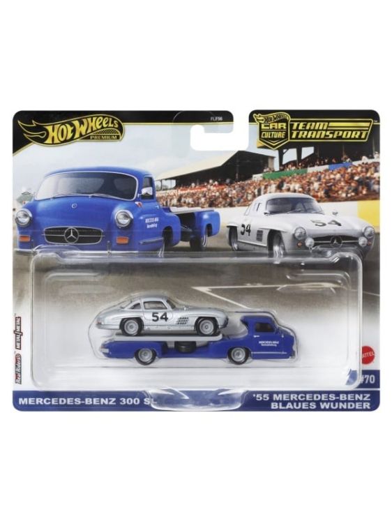 Sortimentul prezinta modele premium de transportatoare la scara 164 ce sunt cautate si indragite atat de copii, cat si de adulti colectionarii si pasionatii din intreaga lume. Realizate cu multa atentie la detalii si decoruri realiste foarte apreciate de cunoscatori. Sunt compatibile cu pistele si seturile de joaca Hot Wheels (achizitionate separat) si prind o viteza uluitoare pe pista! Transportatoarele vin impreuna cu o masina sport Hot Wheels. Fiecare se vinde separat, in functie de disponibilitate. Setul contine un transportor ཱི Mercedes-benz si o masinuta Mercedes-benz 300SL.