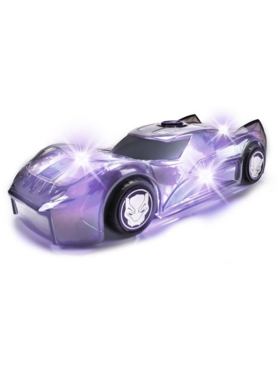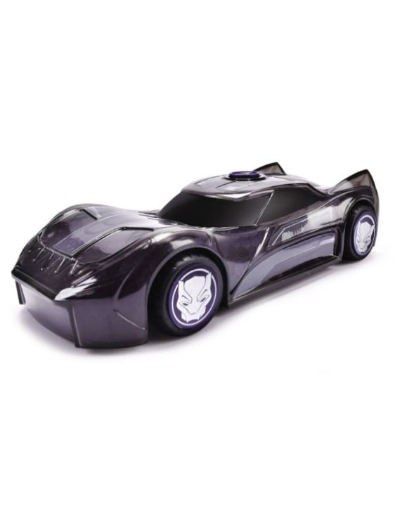 Light Hero Black Panther car (15 cm) - Masina de jucarie supererou cu frecare si efecte de lumina si sunet cool, jucarii cu masina pentru copii cu varsta peste 3 ani, incl. baterii. The King of Wakanda T`Chaka - alias supereroul Black Panther - a prezentat fanilor sai sub forma unei masini de jucarie impresionante cu frecare! Design izbitor - putere si gratie combinate intr-un singur model de masina caroseria neagra cu accente violet si capul puternic de pantera pe anvelope intruchipeaza stilul nobil al MARVEL Avenger. Apasarea unui buton lumineaza vehiculul super-erou cu grafica LED schimbatoare (toate bateriile incluse), permitand detaliilor emblematicei armuri Panther sa straluceasca. Sunete puternice - MARVEL Light Hero cu licenta oficiala ofera sunete epice care surprind spiritul eroului sunete misterioase din jungla, zgomot captivant de lupta si vuietul unui motor puternic.