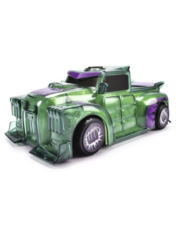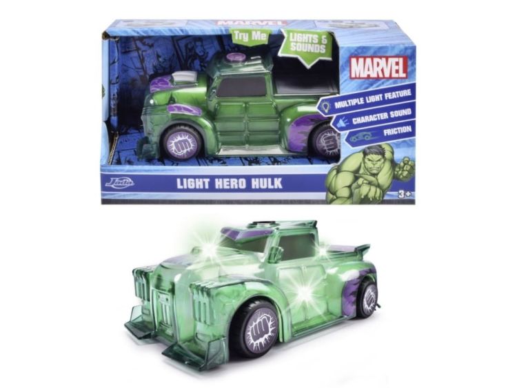 Light Hero Hulk car (15 cm) - Masina de jucarie supererou cu frecare si efecte de lumina si sunet cool, jucarii cu masina pentru copii cu varsta peste 3 ani, incl. baterii. Cu designul sau verde masiv, masina de jucarie MARVEL cu licenta oficiala &bdquoLight Hero&rdquo (15 cm) prezinta in mod eficient puterea extraordinara a Incredibilului Hulk. O mica apasare este suficienta pentru a dezlantui energia lui Hulk masina continua sa se rostogoleasca singura, ca si cum colosul verde de benzi desenate ar fi impins-o. La o apasare de buton, grafica LED de sub masina transforma caroseria transparenta intr-o fiara luminoasa, verde - un adevarat spectacol pentru fete si baieti de la 3 ani. Raaaawwww! - 3 sunete originale Hulk insotesc efectele de lumina un tipat tunator al lui Hulk, legendarul &bdquoHulk Smash!&rdquo si urletul motorului vehiculului.