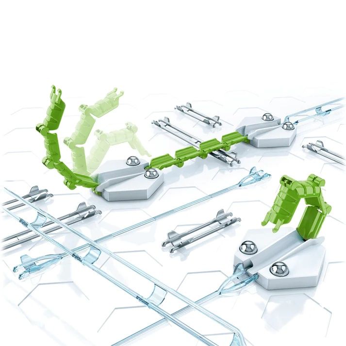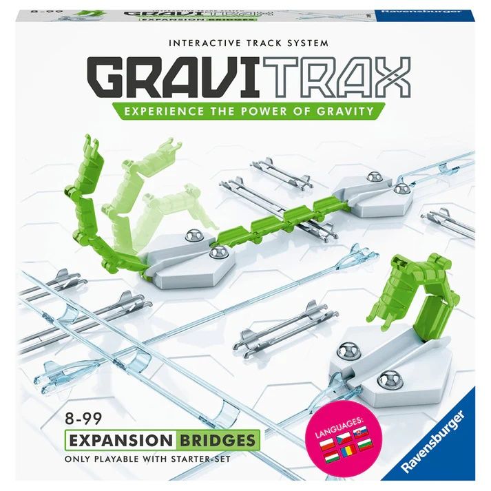 Noul set de accesorii Ravensburger - Poduri Gravitrax completeaza setul de baza Gravitrax cu doua poduri si un set de sine. Podurile se indreapta in fata mingii si permit trecerea la un alt punct de pe traseu.