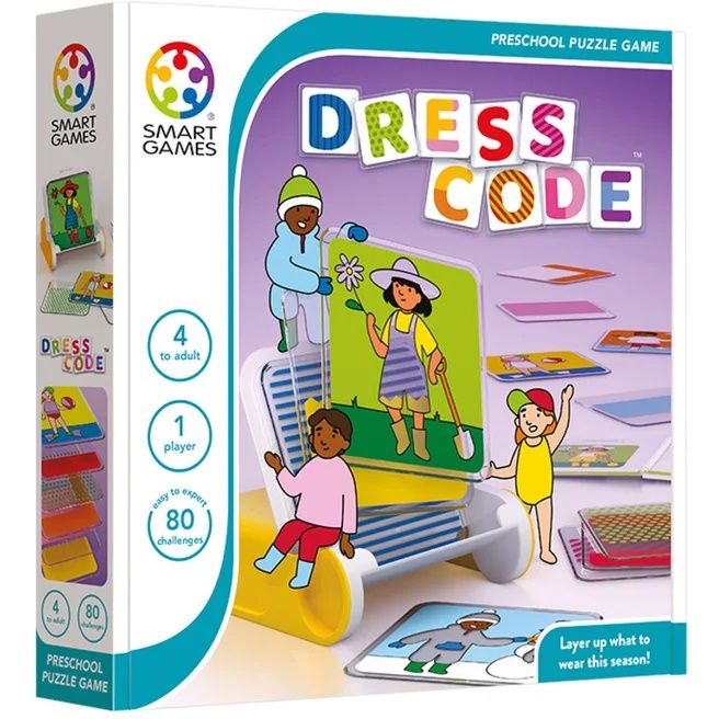 Dress Code este un joc pentru copii din seria Smart Games cu elemente de inalta calitate. Jocul include 80 de provocari logice cu dificultati crescatoare, recomandat pentru varstele 4+.
