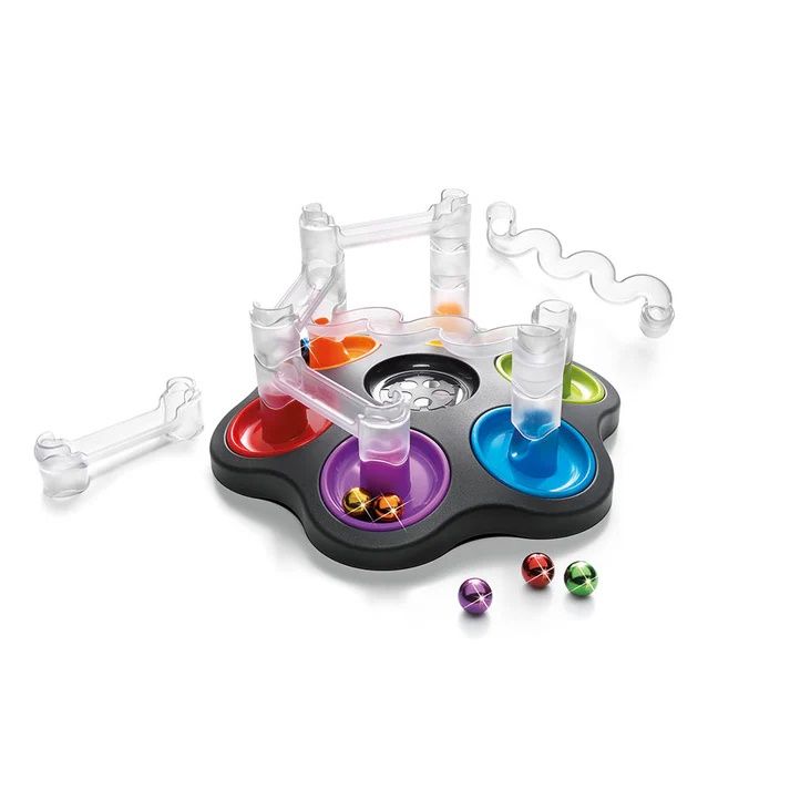 Contine: 1 tabla de joc cu 6 baze, 6 bile, 2 distantiere, 5 rampe scurte, 2 rampe lungi, 1 brosura cu 80 de provocari si solutii.