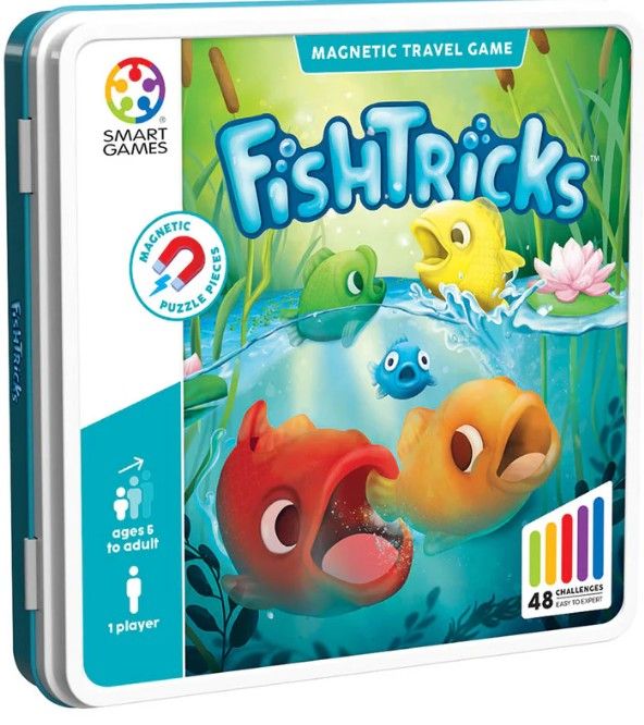 FishTricks este un joc de calatorie distractiv si captivant, din seria Smart Games, de inalta calitate, care vine intr-o cutie metalica robusta si 48 de provocari logice cu dificultati crescatoare, recomandat pentru varstele 5+, care testeaza si dezvolta abilitatile cognitive ale jucatorilor.
