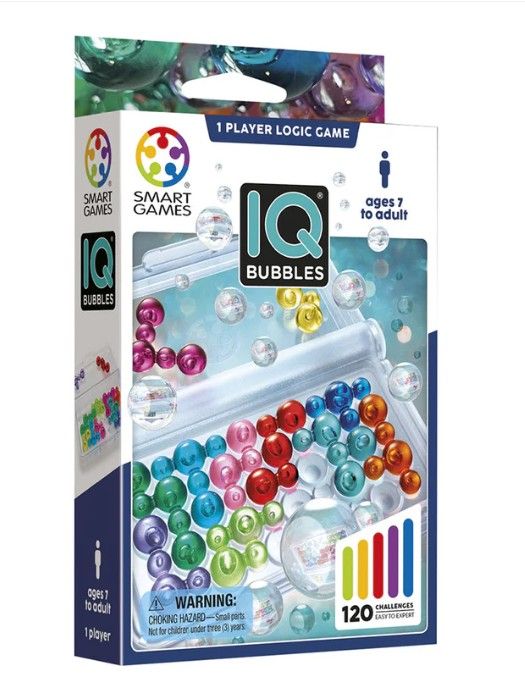 IQ Bubbles este joc de logica compact si portabil, din seria Smart Games, de inalta calitate, care vine intr-o cutie cu capac transparent si are 120 de provocari logice cu dificultati crescatoare, recomandat pentru varstele 7+, care testeaza si dezvolta abilitatile cognitive ale jucatorilor.