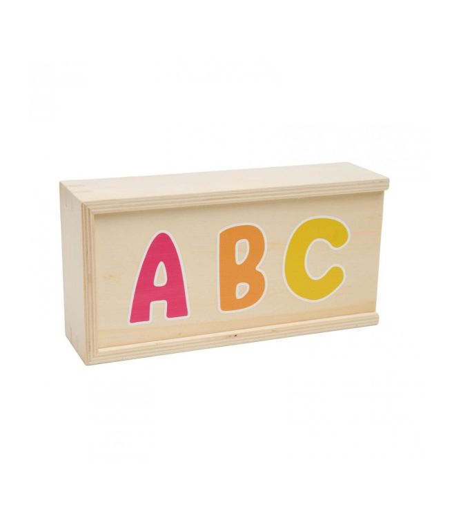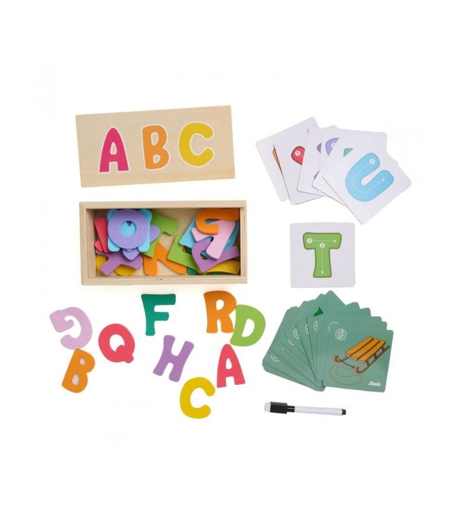 Jocul include 26 de litere din lemn viu colorate, 26 de cartonase asortate, 1 marker ce se sterge si o cutie de depozitare din lemn.