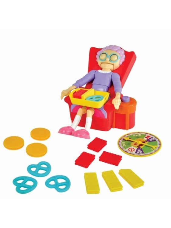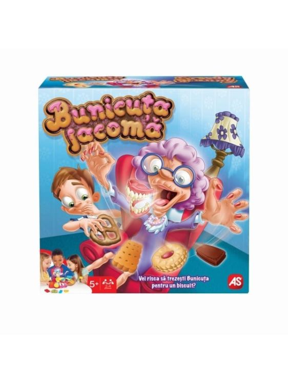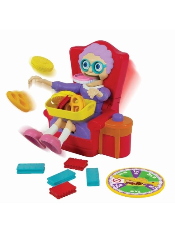 Joc de societate bunicuta lacoma. Luati biscuitii, dar nu treziti bunicuta! Bunicutei ii plac la nebunie biscuitii si vrea sa ii pastreze numai pentru ea! Atunci cand bunicuta atipeste, este timpul sa ii luati biscuitii! Asteptati-va randul si incercati sa ii luati biscuitii, dar... sa nu cumva sa o treziti! Produsul necesita asamblare. Jocul contine 1 Bunicuta in fotoliu (2 componente), 1 cadran, 12 biscuiti.