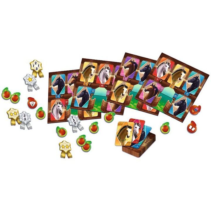 Jocul de masa &bdquoHappy Horses&rdquo ofera o experienta de joc incantatoare, de inalta calitate, in care caii joaca rolul principal. Jocul consta dintr-un set bogat ilustrat si detaliat de carti de cai, cu un total de 112 variante, care fac fiecare joc unic si variat. Jucatorii au la dispozitie si patru table stabile, intre care trebuie sa manevreze strategic pentru a obtine cele mai multe puncte posibile. În timpul jocului interesant, jucatorii trebuie sa foloseasca, de asemenea, jetoane panglica si jetoane diamant, care totalizeaza 12 si, respectiv, 20 de piese si ofera oportunitati suplimentare si avantaje strategice pentru jucatori. Esenta jocului este ca, atunci cand se intuneca, trebuie sa ajuti caii sa se intoarca la propriile boxe si sa colecteze mere in acest proces. La final, castigatorul este cel care aduna suficiente mere si puncte pentru a inchide cutiile. Jocul este recomandat pentru varsta de 7 ani si poate fi o alegere excelenta pentru toti copiii si adultii, in special cei interesati de cai si jocuri de societate de strategie. Joc de masa Happy Horses- 112 carti de cai- 4 scanduri stabile- 12 jetoane panglica- 20 de felii de mere.