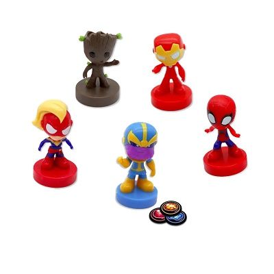 In cutia jocului veti gasi 17 figurine superbe, realizate cu finete din rasina de calitate, cate 4 pentru fiecare erou Marvel: Groot, Iron Man, Spiderman, Captain Marvel si Thanos, din celebrele desene animate Marvel.