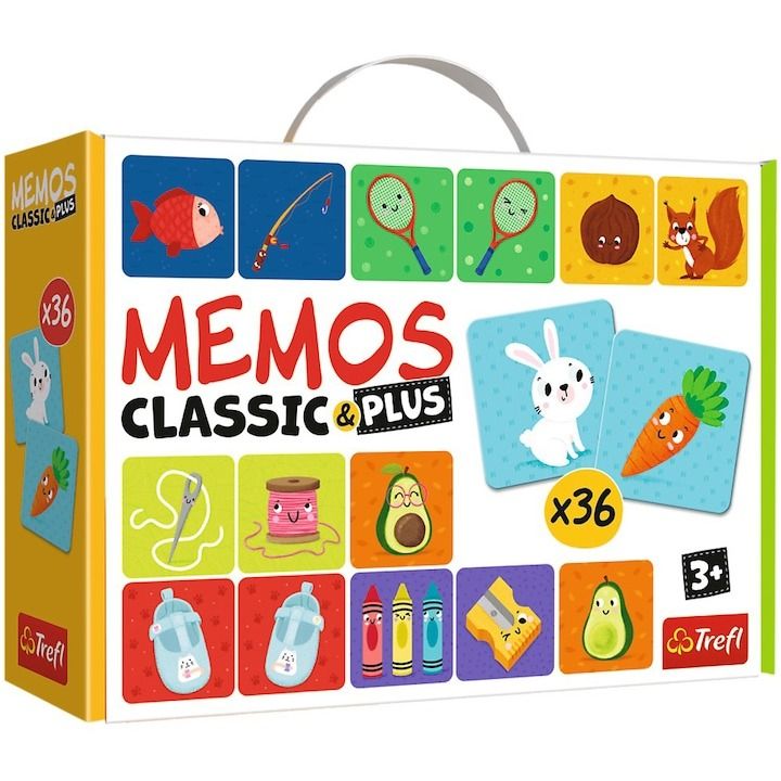 Memos Classic Plus este prima versiune a jocului care dezvolta memoria copilului dumneavoastra. Scopul jocului este de a aduna cat mai multe perechi. Jocul de memorie a fost creat pentru cei mici. Jocul include elemente mari, frumos ilustrate, din carton gros, care se potrivesc cel mai bine. Jocul antreneaza memoria si sustine dezvoltarea cognitiva a bebelusului. Pachetul contine 36 de cartonase, o tabla de joc cu sageata pentru tragerea la sorti, instructiuni.