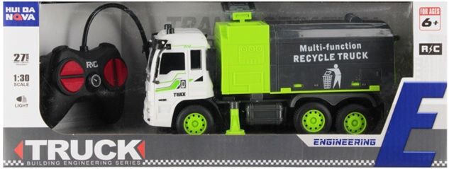 Conținutul setului: Camion de gunoi, container de gunoi, telecomandă.