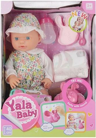 Conținutul setului: păpușă de 40 cm, 1x olita, 1x scutec, 1x suzetă, 1x biberon de lapte, 1x lingură, 1x bavetă.