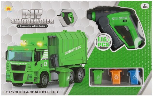 Camionul de gunoi are efecte de sunet și lumină, șurubelnița are un burghiu rotativ.
