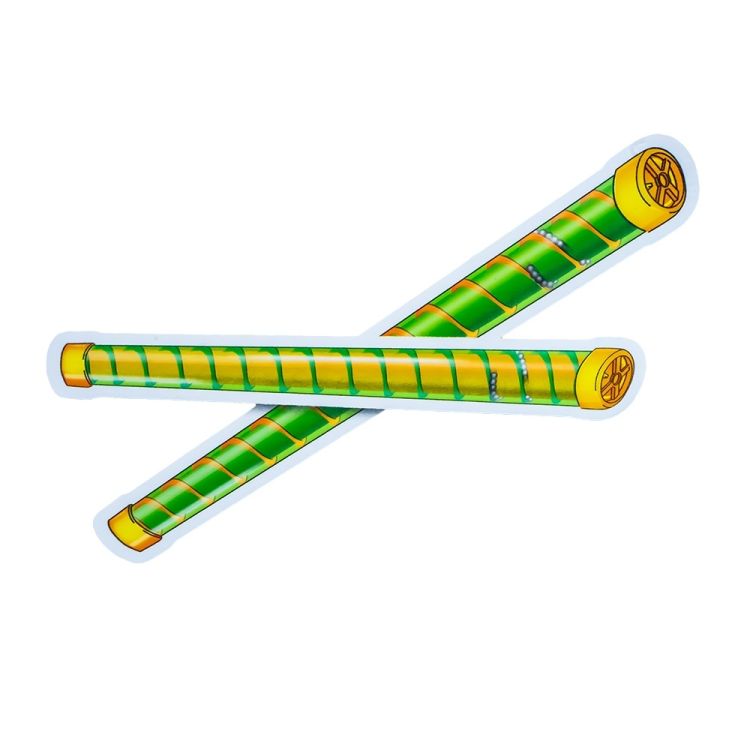 - Jucaria are design creativ, cu forma tubulara, cu spirala interioara pe care sunt plasate bile metalice zornaitoare care vor cobori la fiecare rasturnare a bastonului. Spirala este asezata pe un alt tub central care la randul lui produce un sunet ascutit, prin vibratia unei coloane de aer, la trecerea unui cilindru cu lamela.