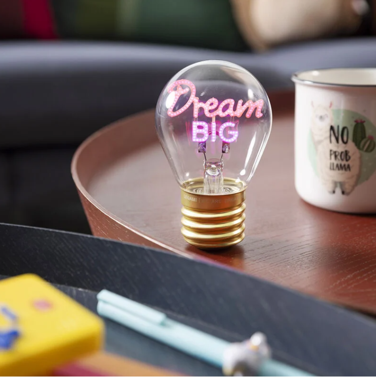 Aceasta lampa de masa cu mesaj motivational, comercializata de Legami, combina estetica moderna cu functionalitatea practica. Forma sa inspirata de un bec clasic, impreuna cu detaliile ce transmite un mesaj motivational, o transforma intr-un obiect decorativ inedit pentru birou sau noptiera.
