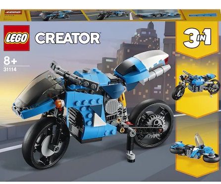 nspira pasiunea copiilor pentru motociclete cool si constructie creativa cu impresionantul set de jucarii Super motocicleta LEGO Creator 3 in 1 (31114). Copiii vor adora sa puna in scena actiunea palpitanta a curselor cu aceasta motocicleta moderna de jucarie avand ghidon mobil, suspensie functionala si un picior de sprijin.