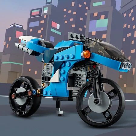 Copiii se pot bucura de 3 experiente diferite de constructie si joaca in acest set de jucarii LEGO Creator 3 in 1. Ei pot construi Super motocicleta moderna si apoi o pot reconstrui intr-o motocicleta clasica cu picior de sprijin, pot face o motocicleta planor fantezista pentru aventuri in inaltul cerului sau isi pot folosi imaginatia pentru a crea ceva nou.