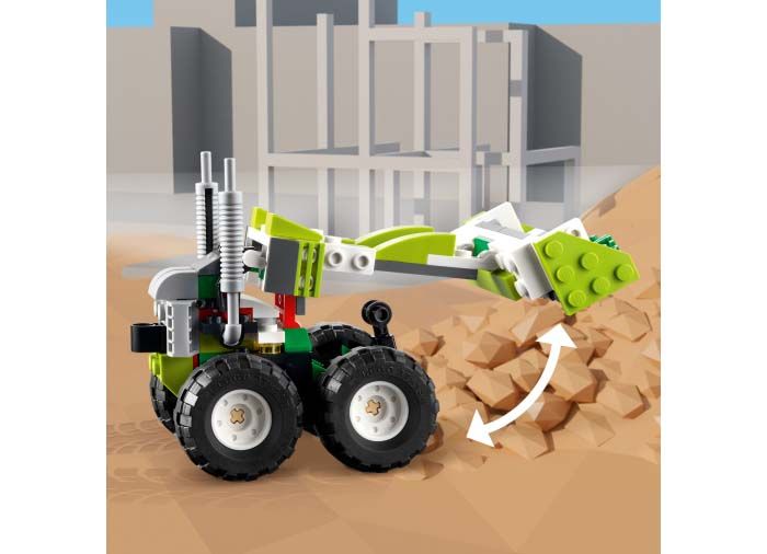 Copiii se pot bucura de 3 experiente diferite de constructie si joaca cu acest set de jucarii LEGO Creator 3 in 1. Ei pot construi Automobilul de teren Buggy si apoi il pot reconstrui ca un mini incarcator puternic cu o platforma de ridicare cool, pot crea un ATV (vehicul pentru toate tipurile de teren) pentru mai multa actiune de curse, sau isi pot folosi imaginatia si acelasi set de caramizi pentru a crea ceva nou.