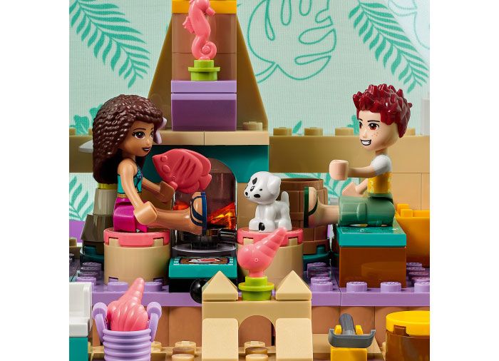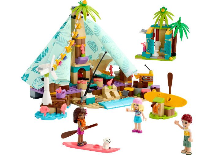 Acest set camping luxos de colectie include 2 placi de surf cu care personajele LEGO Friends exploreaza zona de coasta si natura cu catelul Pebble. Pe uscat pot cauta scoici si pot construi castele de nisip, apoi se pot racori in dusul si toaleta din exterior. Pe debarcader pot pescui si pot gati captura pe soba cortului, avand scaune confortabile si paturi supraetajate.