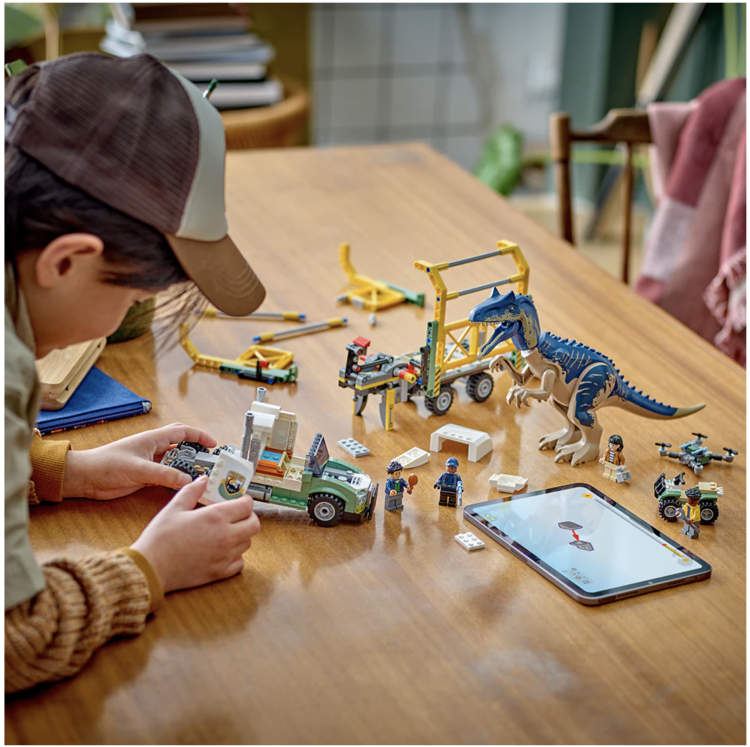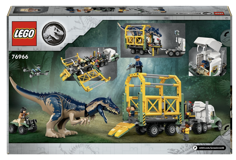 Aventuri noi si neasteptate cu animale ii asteapta pe fanii de 8+ ani in modelul Misiunea ”Dinozaur”: Camion de transport pentru un Allosaurus (76966) plin cu posibilitati de joaca pe roluri. Acest set cu dinozauri LEGO® Jurassic World poate fi un cadou atractiv pentru o petrecere de copii. Le permite copiilor sa creeze nenumarate povesti de actiune folosind figurina turnata Allosaurus cu picioare si cap mobile si gura care se deschide, precum si minifigurinele Darius, Kenji, Yaz si gardian. In set se afla un camion cu un acoperis si o capota care se deschid, o cabina pentru 3 minifigurine cu un pat, o remorca cu cusca cu suporturi frontale si o rampa la spate care se deschide, o cusca care se deschide prin apasarea unui maner, un ATV si o drona, precum si o multime de elemente initiatoare de povesti.