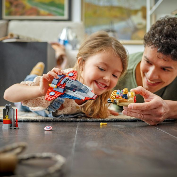 Jucaria de constructie si joaca include 2 minifigurine: Thanos intr-o nava spatiala conceputa sa arate precum Manusa Infinitului, cu degete mobile si un lansator de rachete; si Capitanul America, intr-un Quinjet super elegant cu 2 arme de foc, un cockpit care se deschide si un compartiment ascuns pentru scutul supereroului. O constructie separata reprezinta o piatra cosmica pentru a-i inspira pe copii sa-si imagineze cum Capitanul America incearca sa-l opreasca pe Thanos sa fure piatra pretioasa. Fiecare punguta din cutie contine caramizi si o caramida mare pentru incepatori care sa faciliteze constructia rapida a modelului si personajului, astfel incat joaca sa poata incepe in scurt timp. Instructiunile intuitive sunt oferite intr-o brosura colorata. Setul contine 107 piese.