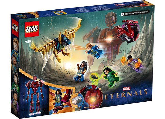 Copiii isi unesc fortele cu 4 Eterni pentru a invinge un liliac Deviant. Eternii au puteri cool: Ajak este singurul capabil sa comunice cu Celestii, puternicele fiinte extraterestre; Sersi transforma materia in orice doreste; Ikaris are o forta supraomeneasca; iar Kingo poate declansa explozii de energie terestra. Setul include si o figurina Celest pozitionabila, care poate tine in mana o minifigurina Etern. Iar daca jucaria este pentru un fan al minifigurinelor, acest formidabil set de joc LEGO este singurul in care apar minifigurinele Ajak si Kingo!