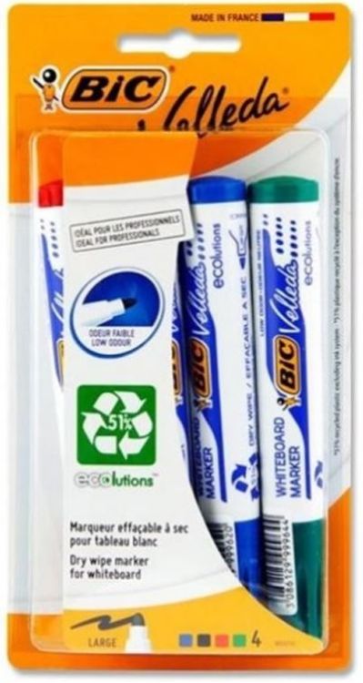 Markerele BIC Velleda 1701 ECOlutions cu varful rotund, care se sterg cu buretele uscat, din acest set de 4 sunt disponibile in clasicele culori: negru, albastru, rosu si verde.