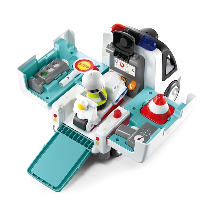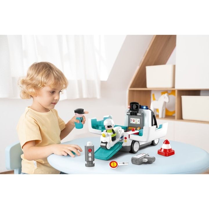 Masinuta de jucarie de politie pentru invatare timpurie este un set educativ destinat copiilor cu varste intre 1. 5 si 5 ani. Include o masinuta de politie, un politist jucarie, o motocicleta si semne de circulatie. Produsul are 2 moduri de joc si 8 echipamente de trafic, oferind o experienta interactiva care ajuta pe cei mici sa invete reguli de circulatie si sa-si dezvolte abilitati motorii si cognitive. Setul este colorat, sigur si potrivit pentru joaca educativa timpurie.