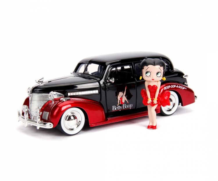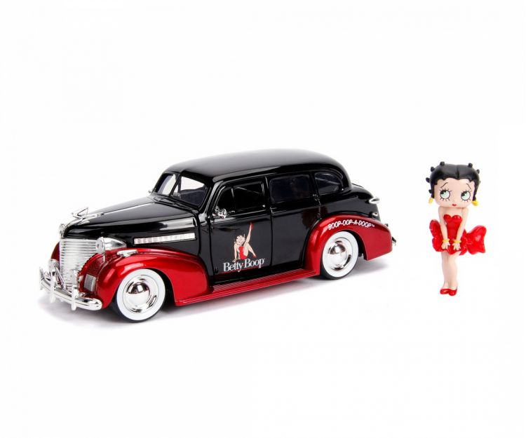 Masinuta din metal Chevy Master cu usi, capota si portbagaj ce se pot deschide, scara 1: 24. Pachetul include o figurina Betty Boop.