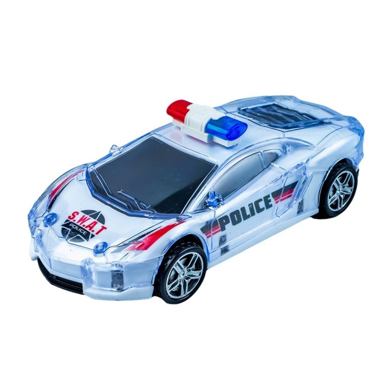 - Aceasta jucarie este foarte atractiva, datorita design-ului modern. Aceasta are caroserie din plastic alb peste care este o carcasa transparenta, caroseria fiind inscriptionata POLICE si SWAT. Aspectul cool al masinii este completat de jantele cu aspect cromat si girofarul cu lumini de semnalizare.