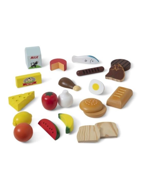 Set alimentar robust din lemn, cu ingrediente din cele cinci grupe alimentare pentru o joaca sanatoasa si prefacuta. Include pepene verde, lapte, branza, peste, oua si multe altele. Se depoziteaza ordonat in patru lazi de lemn. Distractiv si educativ, fie ca jucarie independenta, fie ca parte a unei bucatarii de jucarie. Planificarea unei mese echilibrate este o joaca pentru cei mici cu acest set de mancare de jucarie din lemn. Produse din cele cinci grupe alimentare, inclusiv pepene verde, lapte, branza, peste, oua si multe altele - sunt fabricate din lemn masiv si vin cu patru cosuri din lemn pentru sortare si depozitare.