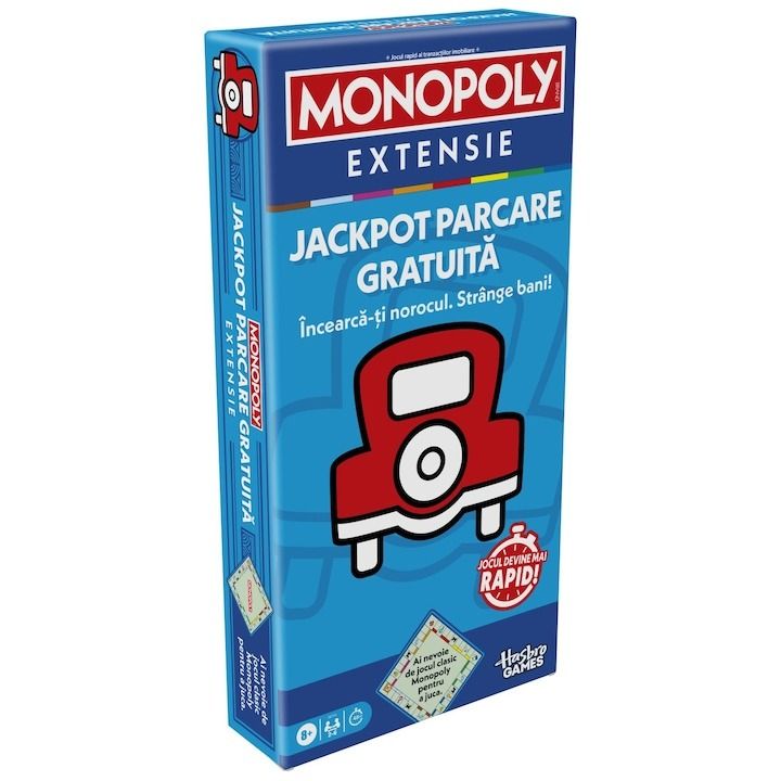 Incearca-ti norocul si strange bani! Extensia Monopoly Free Parking Jackpot aduce o intorsatura proaspata jocului Monopoly si dureaza jumatate din timpul de joc. Trebuie doar sa atasezi aceasta extensie la tabla clasica Monopoly si sa transformi locul de parcare gratuita intr-un jackpot. (Este necesar jocul Monopoly clasic pentru a juca. Se vinde separat.) Invarte rotita pentru o sansa de a castiga bani MULTI! Actualizeaza la jetonul Deal Mobile si trage carti Bonus pentru a lua proprietati gratuite si multe altele. Jocul se termina atunci cand toate proprietatile sunt detinute sau cand un jucator a dat faliment. Cel mai bogat jucator castiga! Scoate aceasta extensie captivanta Monopoly pentru Seara de Jocuri in Familie, vacante si distractie rapida oricand. Jocurile in familie si jocurile de societate pentru copii sunt, de asemenea, cadouri cool pentru copii.
