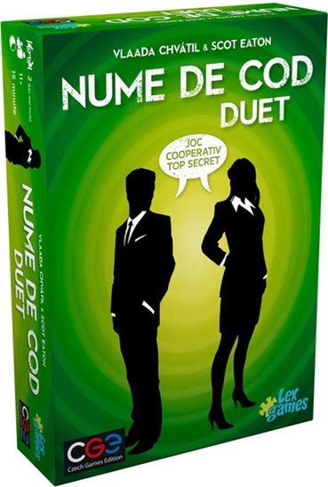 Nume de Cod: Duet este un joc de cuvinte cooperativ pentru doi sau mai multi jucatori. O carte cheie iti ofera 9 cuvinte pentru care trebuie sa dai indicii si 3 cuvinte pe care partenerul tau trebuie sa le evite. Un indiciu inseamna un singur cuvant, dar poate conduce spre mai multe cuvinte pe care vrei ca partenerul tau sa le ghiceasca. Partenertul tau iti va oferi indicii pentru cuvintele pe care trebuie tu sa le gasesti. Daca ambii gasiti indiciile inanite de terminarea timpului, castigati amandoi.