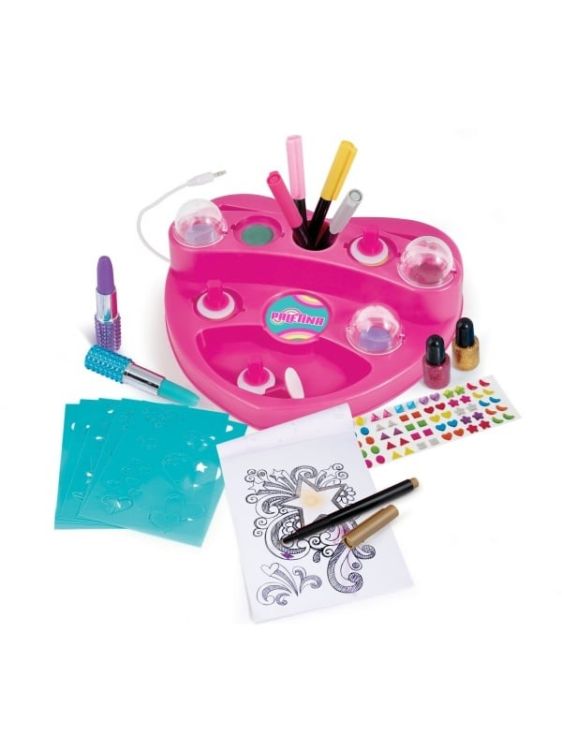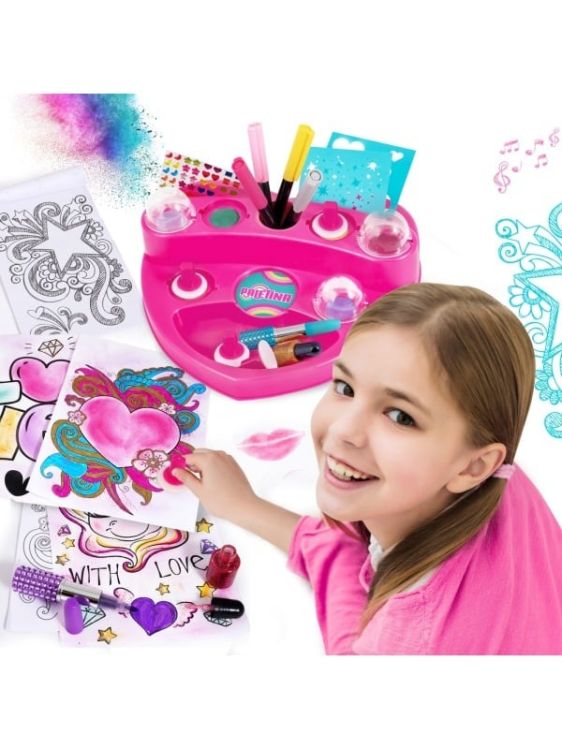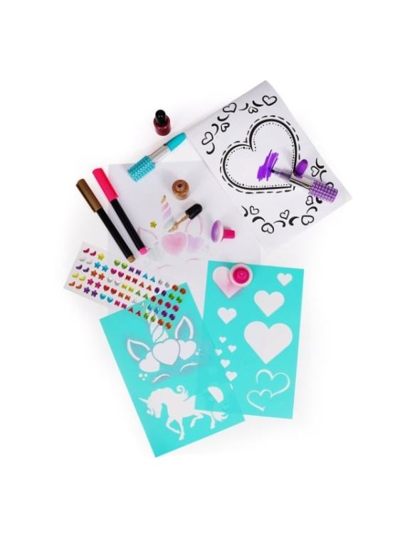 PALETINA, paleta fantastica pentru desen! Vopsele pudra, markere, pensule, sclipici, stickere cu pietre pretioase, bloc de desen si sabloane pentru desene minunate sunt incluse pentru ca cel mic sa deseneze fara sa se opreasca! Deseneaza-ti proprii unicorni, stele, inimi si alte desene magice cu ajutorul pudrelor de pictura si decoreaza-le cu sclipici si autocolante. Rezultatul va va fascina! Acest produs preferat al anilor ྖ este din nou aici, reinnoit si gata sa fie indragit si de tinerele generatii! Este o alegere ideala pentru un cadou, deoarece ii ofera copilului nenumarate optiuni pentru a-si exersa creativitatea cu diverse tehnici de pictura, dezvoltandu-si in acelasi timp imaginatia. Include 1 paleta de pictura in forma de inima, 6 vopsele pudra, 6 pensule burete, 6 foi de sablon, 5 markere (cu sclipici si de culoare), 2 markere ruj, 2 borcane de lipici cu sclipici, bloc de desen si stickere cu pietre pretioase