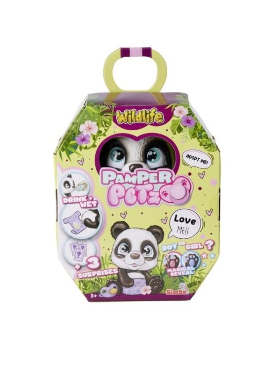 Cu acest panda dragut din familia Pamper Petz, iubitorii de animale mici cu varsta de 3 ani si peste primesc un animal de companie dulce de hranit, ingrijit si iubit - inclusiv un certificat de adoptie! La fel ca toti bebelusii de animale Pamper Petz, figura panda de aproximativ 15 cm inaltime cu ochi mari stralucitori poate bea apa reala si poate face pipi. Pana si scutecul devine galben! Proaspata mama si tata pot afla daca au adoptat o fata sau un baiat stergand labuta cu apa Este albastru sau roz?