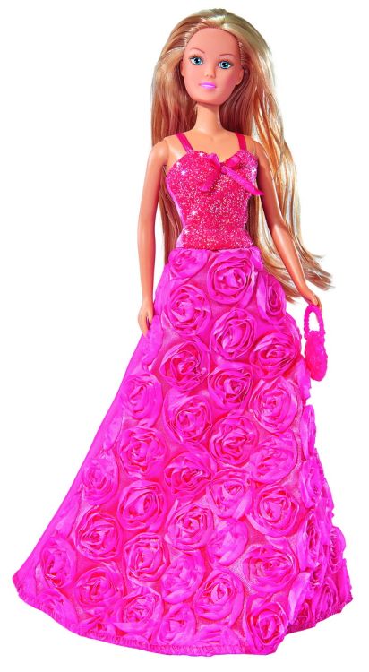 Papusa Steffi vine si ne incanta cu rochita inflorata, de gala, ca de printesa. Papusa este imbracata intr-o frumoasa rochie, de culoare rosie, plina cu trandafiri. Papusa are o inaltime de 29 cm. In pachet sunt incluse o gentuta si o perie pentru parul ei blond, foarte frumos.