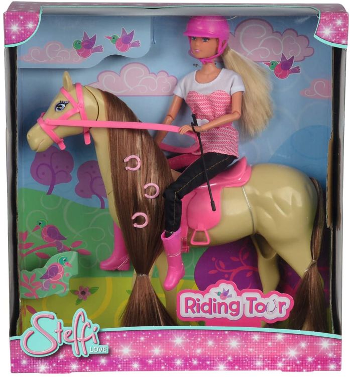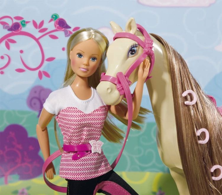 Steffi este imbracata in costum de echitatie si iese la plimbare impreuna cu calutul ei favorit. Papusa are toate articulatiile mobile si masoara 29 cm inaltime.