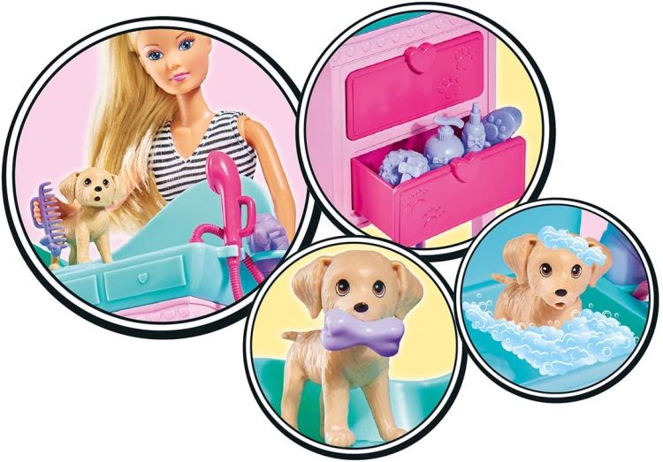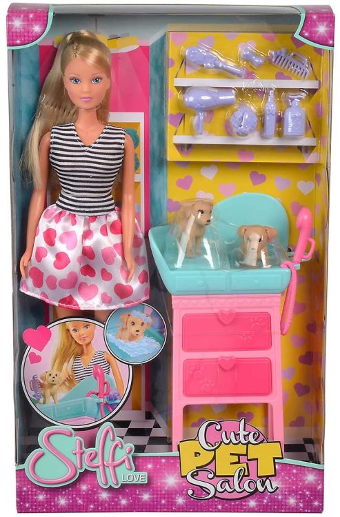 Steffi lucreaza la salonul de infrumusetare a animalutelor. Ea ingrijeste cei 2 catelusi cu ajutorul accesoriilor incluse in set. Steffi Love este o adevarata papusa de moda. Ii plac hainele elegante, coafurile la moda, sora ei mica Evi si bineinteles iubitul ei Kevin. Fetele isi pot stiliza si imbraca papusa in cele mai noi tendinte ale modei.