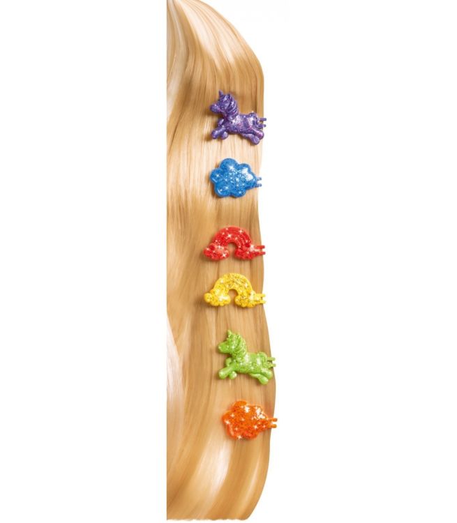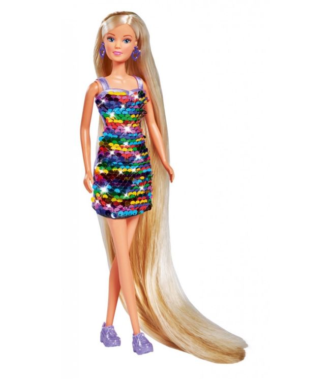 Steffi are parul foarte si lung si este imbracata intr-o rochie cu paiete cu efecte de curcubeu. Setul include si accesorii pentru ingrijirea parului. Inaltime papausa 29 cm.