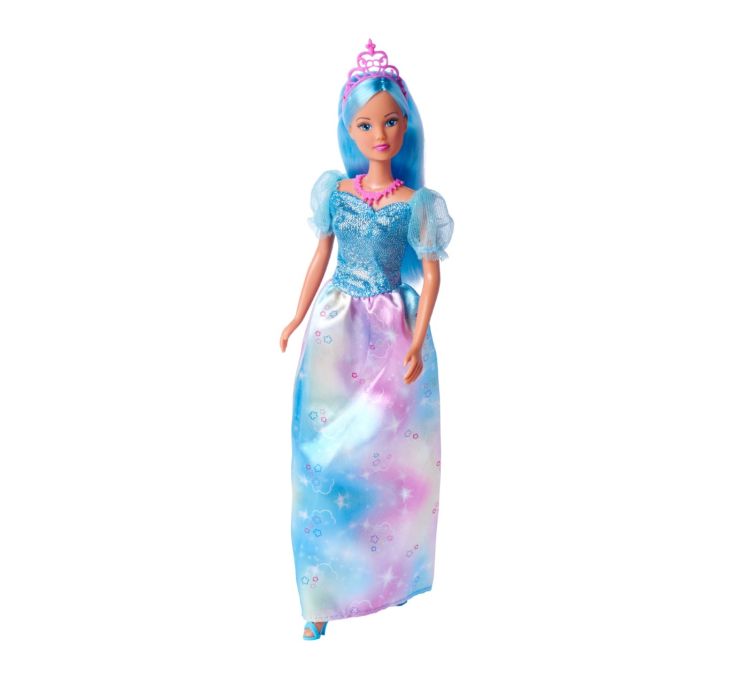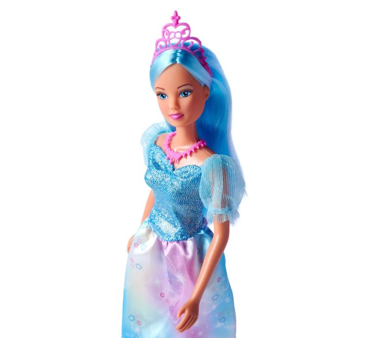Joaca-te si aduna distractie cu magicele printese curcubeu Steffi Love de la Simba cele trei printese frumoase cu par colorat ofera distractie imaginativa si fac inimile copiilor sa bata mai repede! Fiecare papusa poarta o tinuta incantatoare, constand dintr-o rochie lunga cu o fusta stralucitoare si un corset sclipitor cu maneci bufante. Sunt incluse si pantofi asortati, un colier si o coroana! In acest pachet gasiti o papusa imbracata intr-o rochie de printesa albastra.