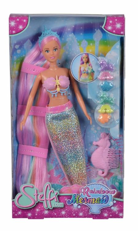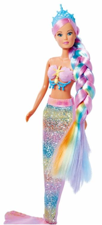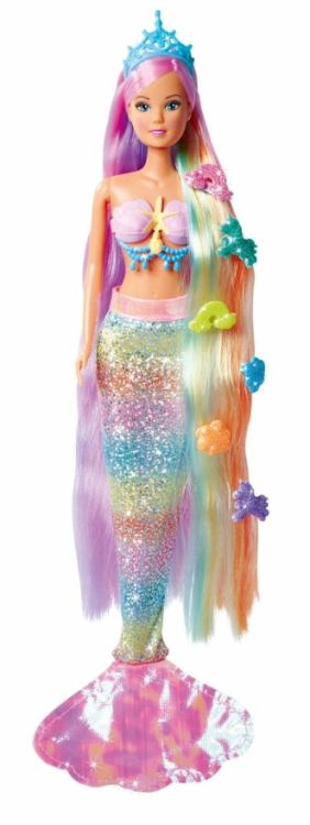 Steffi se transforma intr-o sirena cu parul in culorile curcubeului. Steffi are parul lung, pentru a-l putea pieptana, Steffi are un pieptene in forma de calut de mare. Inaltime papusa: 29 cm.