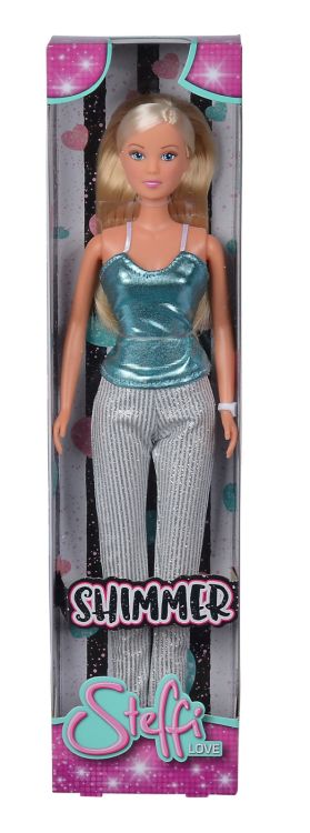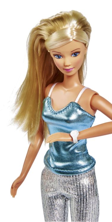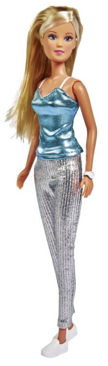 Papusa Steffi poarta o tinuta la moda, accesorizata cu un ceas si adidasi, inaltime papusa 29 cm. Papusa Steffi era imbracata intr-un top lucios (albastru sau roz) si pantaloni stralucitori. In picioare are o pereche de sneakersi si un ceas la incheietura care completeaza intregul stil. In acest pachet veti regasi o papusa Steffi imbracata cu pantaloni albi.