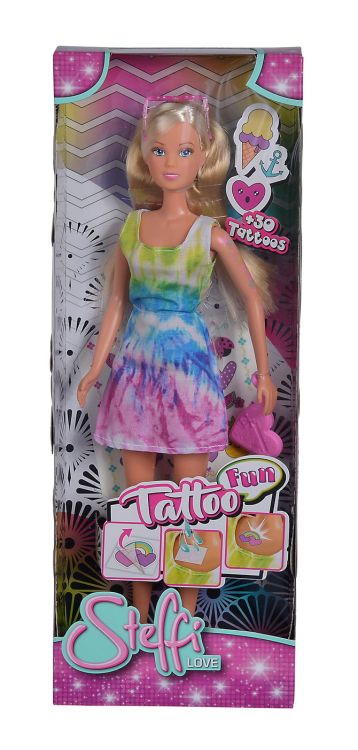 Steffi poarta o rochie colorata iar setul contine peste 30 de tatuaje pentru papusa. Steffi Love este o adevarata papusa de moda. Ii plac hainele elegante, coafurile cu stil, sora ei mica Evi si bineinteles iubitul ei Kevin. Fetele isi pot stiliza si imbraca papusa in cele mai noi tendinte ale modei.