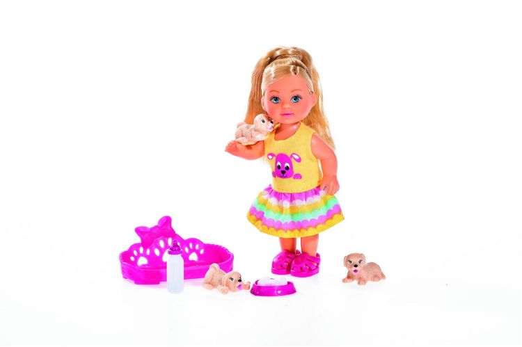 Evi pur si simplu isi adora cei trei noi catelusi. Ea hraneste acesti caini draguti cu o sticla pentru a se asigura ca cresc mari si puternici. In vasul de hranire exista chiar un pic de os pentru a ilmesteca. Le place sa se joace impreuna pana cand sunt obositi si sunt apoi fericiti sa aiba un pui de somn in cosul lor mic. Evi are o camasa lunga si poarta o rochie stralucitoare, cu imprimeu de catelus.