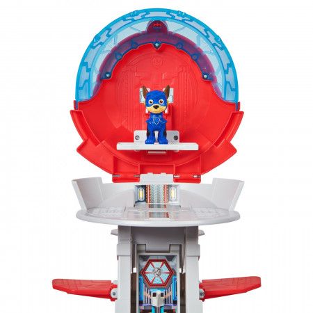 Masurand peste un metru lungime, aceasta jucarie portavion Patrula Catelusilor are lansatoare duble pentru vehicule, o figurina Chase de colectie si vehiculul sau Mighty Pups!