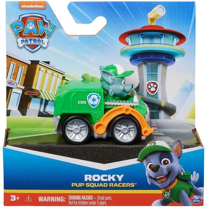Alearga spre misiunea de salvare cu pilotii din Patrula catelusilor Pup Squad Racers. Fiecare masina de curse Pup Squad masoara 6, 3 cm lungime si 5 cm inaltime, astfel incat se potrivesc perfect in palma sau in buzunar, fiind jucariile de dimensiuni perfecte, pe care copiii le pot lua cu ei oriunde. Fiecare catel din Patrula catelusilor este imbracat in uniforma autentica din filmul Patrula catelusilor, cu urechile date pe spate, astfel incat sa para ca alearga cu viteza maxima, la fel ca in serial (fiecare se vinde separat). Cu jucariile din Patrula catelusilor, copiii isi pot explora imaginatia si isi pot dezvolta abilitatile motorii prin jocuri de imaginatie, in timp ce retraiesc scenele lor preferate din film. Pentru si mai multe misiuni distractive si captivante inspirate din seria Patrula catelusilor, colectioneaza toate jucariile din filmul Patrula catelusilor, cum ar fi impresionantul Aircraft Carrier HQ si toate jucariile Patrula catelusilor-editie speciala pentru fete si baieti, cum ar fi personajele si seturile de joaca Mighty Pups, Aqua Pups si Big Truck Pups (fiecare vandut separat). Bucura-te de aventuri grozave si fara sfarsit cu catelusii-eroi preferati din Patrula catelusilor Pup Squad Racers. Acest pachet contine personajul Rocky.