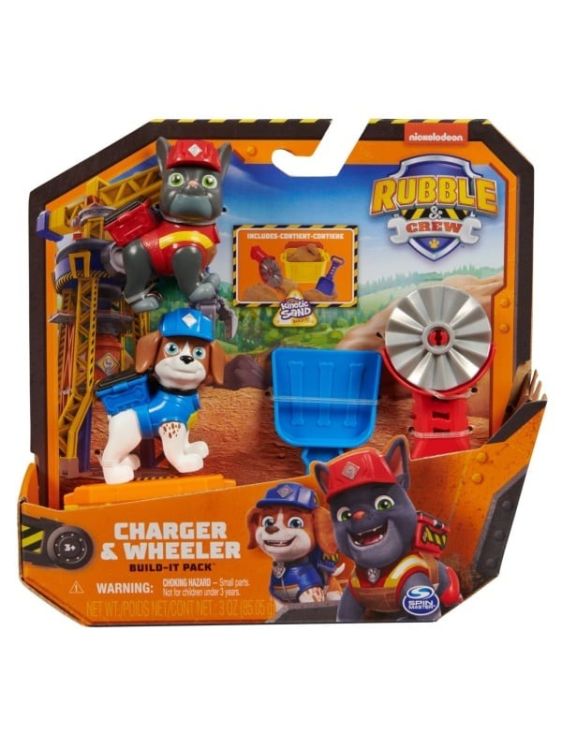 Alatura-te echipei Rubble & Crew cu setul Charger & Wheeler Build-It Pack! Acest pachet distractiv include doua figurine adorabile Charger si Wheeler pregatite pentru actiune in costumatia lor de constructori. Setul contine si accesorii tematice de santier, inclusiv un disc rotativ, o cuva albastra si un recipient cu nisip kinetic pentru si mai multa distractie creativa. Joaca-te, construieste si creeaza aventuri impreuna cu personajele tale preferate din universul Nickelodeon. Recomandat copiilor peste 3 ani.