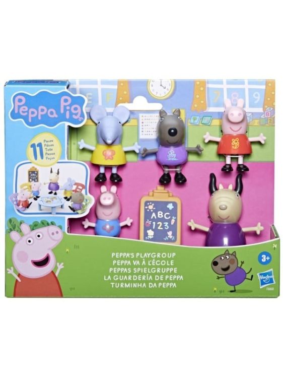 Cand este timpul ca micii porcusori sa mearga la scoala, jucariile, precum setul de joaca Prietenii de la scoala ai lui Peppa Pig, ii pot ajuta sa isi imagineze cum ar putea fi zilele lor. Cu 5 figurine, inclusiv profesoara Madame Gazelle, si accesorii, precum o masa, scaune si o tabla sevalet, copiii isi pot imagina ora de joaca, de pranz si chiar cursurile! Figurinele chiar pot sta pe scaune, iar masa cu doua fete le permite copiilor sa treaca de la activitatile de arta si mestesuguri la ora pranzului. Jucariile Peppa, precum setul de joaca Prietenii de la scoala ai lui Peppa, reprezinta un cadou extraordinar pentru fete si baieti cu varsta de la 3 ani in sus.